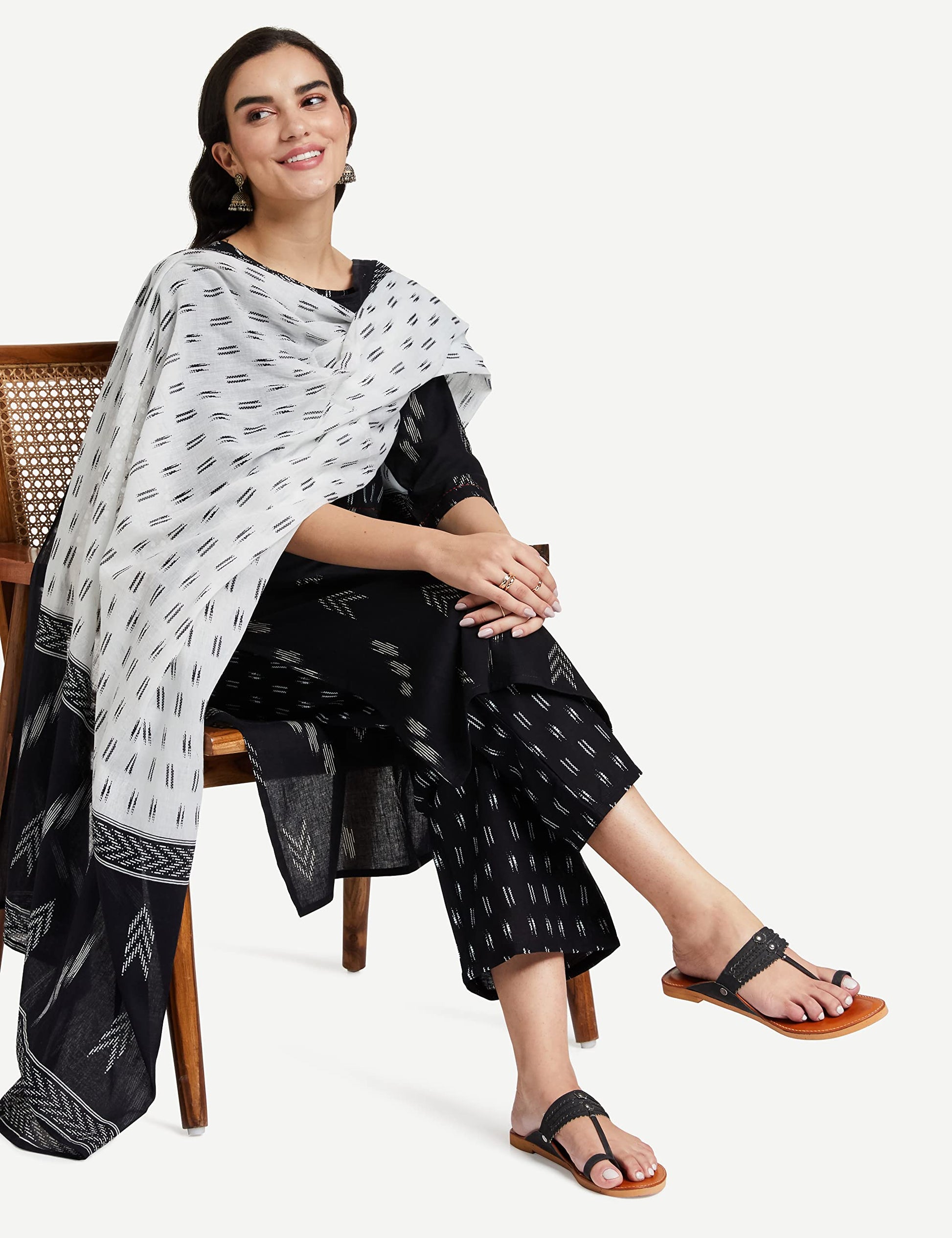 Rytras brings to you this beautiful Straight kurti with Palazzos and dupatta set which is made from Cotton fabric and Black in color with beautiful print over it.This kurta set has been designed keeping in mind the latest trends in contemporary casual fashion. The dress combines ethnic with the fashion of today and makes you stand out among others when you adorn it.