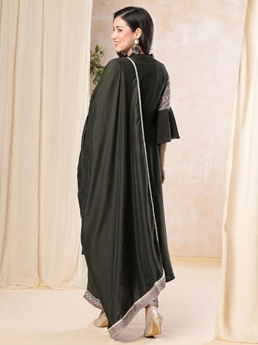 Sanisa Women'S Muslin Digital Printed Anarkali Kurta With Pant And Printed Fabric Lace Work Dupatta (97Kbd1063Nz-L_Dark Olive Green)