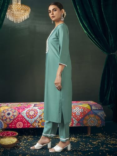 Sanisa Women'S Viscose Chanderi Embroidery Work Straight Kurta With Pant And Dupatta Set (213Kbd2255N-Xl_Mint Green)