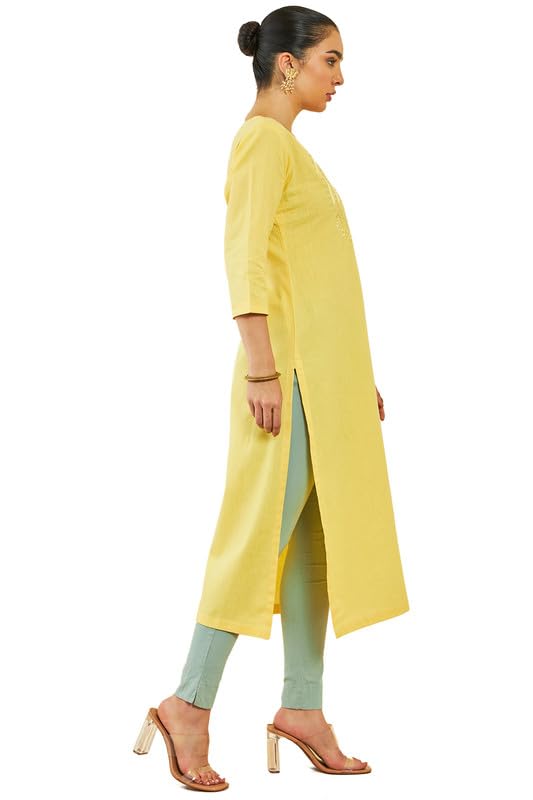 Soch Womens Light Yellow Cotton Flex Embroidered Kurta With Sequins