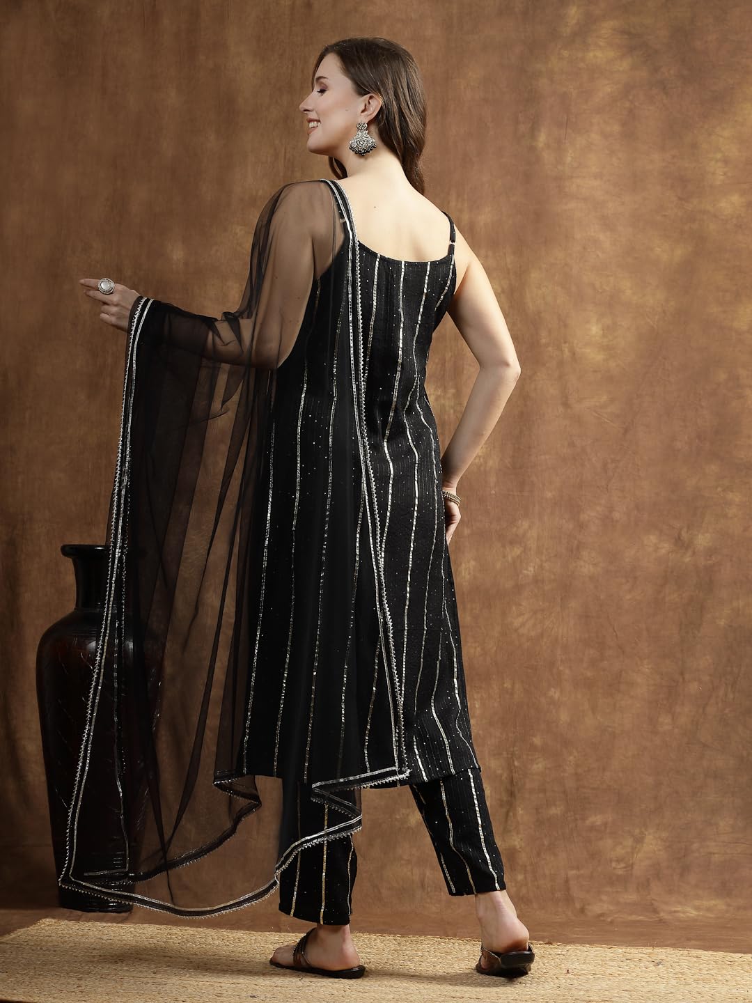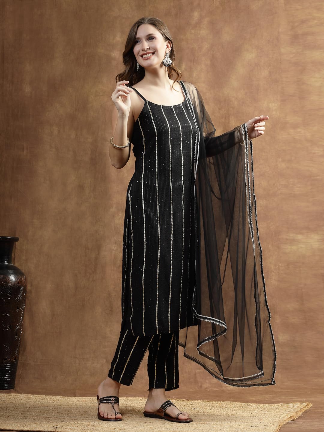 Black gota & sequence work rayon straight kurta with strap sleeves, same fabric pant with full elasticated waistband and solid net dupatta with lace attachment. Kurta Length- 45 Inch, Pant Length - 38'' Inch, Dupatta length - 2.30 mtr.