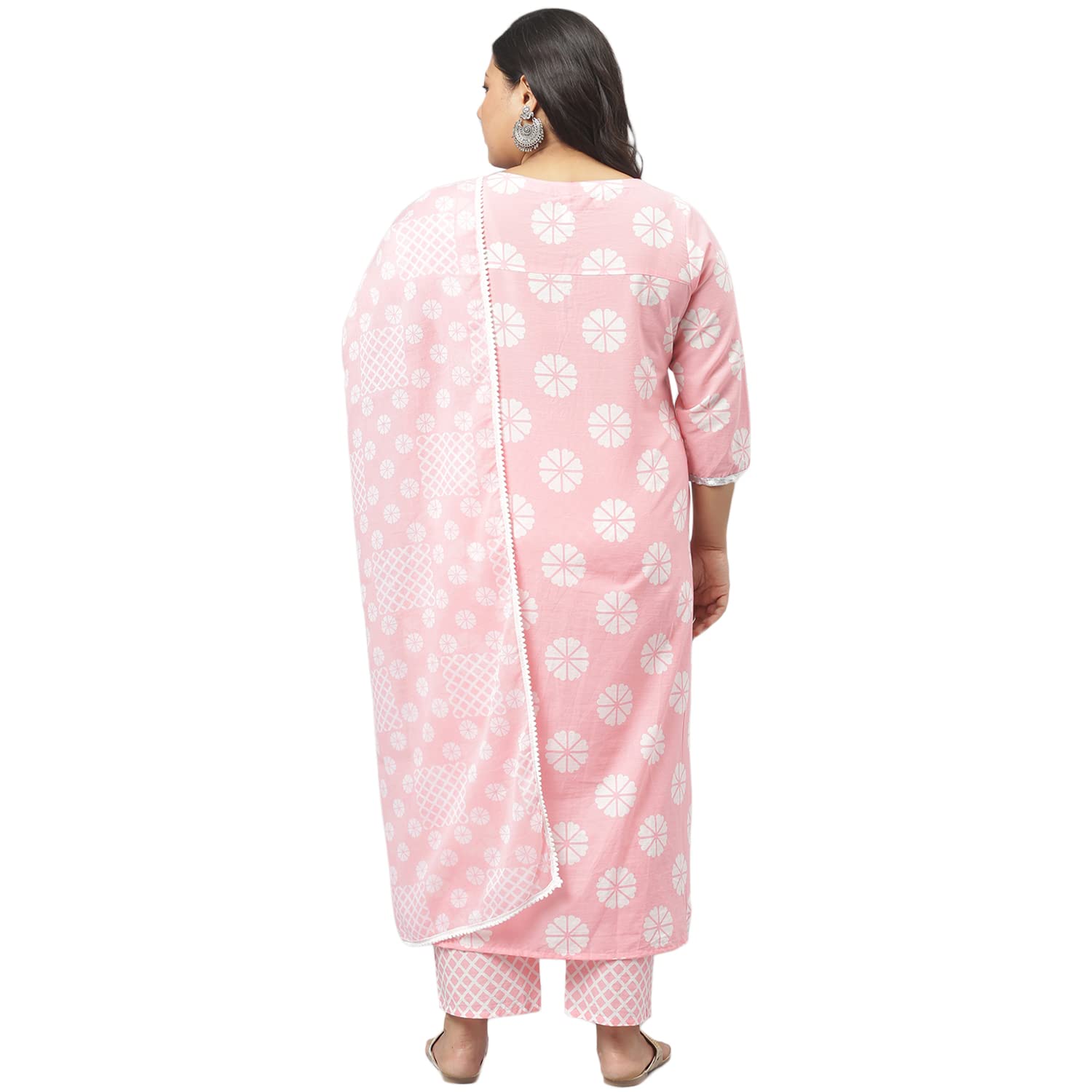 Stylum Women's Plus Size Cotton Printed Straight Kurta Pant Dupatta Set (Light Pink)