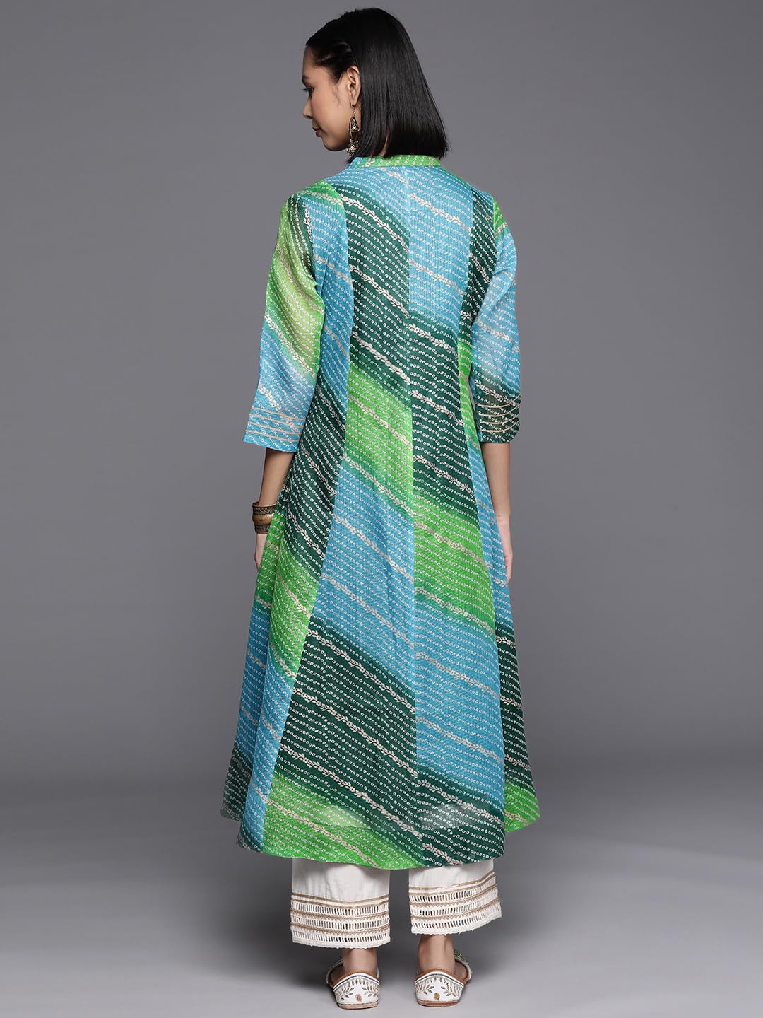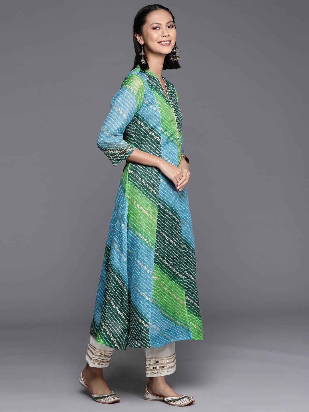 Green And Blue Bandhani Printed Mandarin Collar With Slit And Embellished With Polti Button, Three Quarter Sleeves With Gota Lace Hem Anarkali Kurta