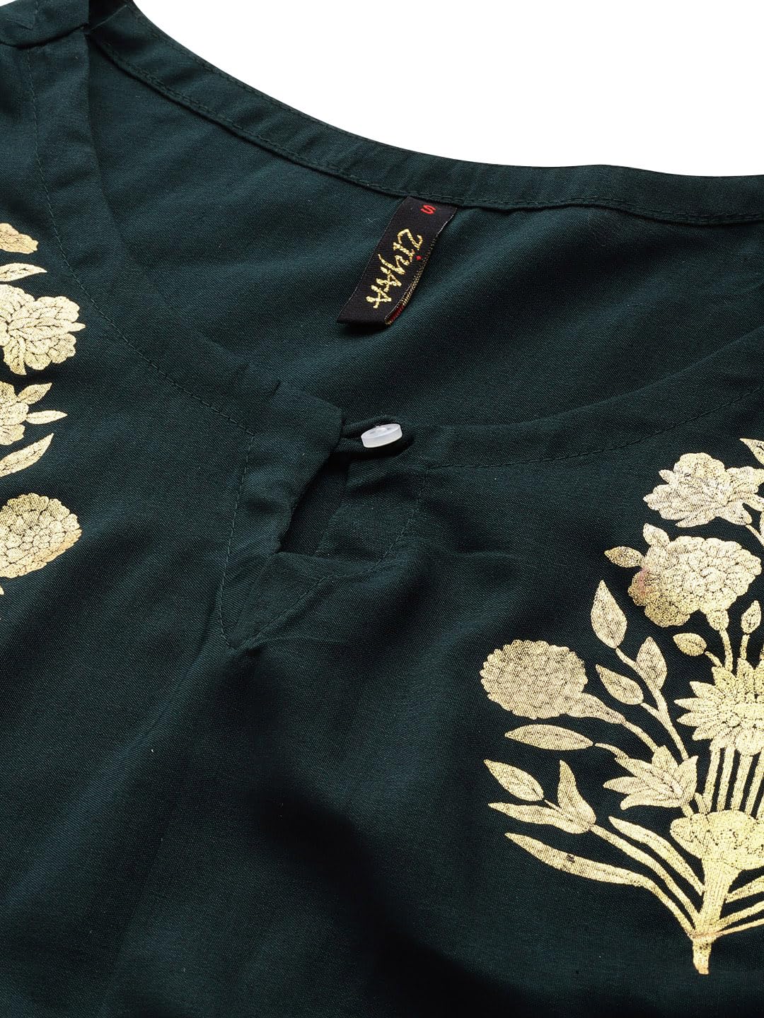 Bottle Green color foil print Chinon kurta with pant and dupatta has round neck,three quarter sleeve,no slit and flared hem.Bottle Green color dyed Chinon pant with elasticated back slip on style.